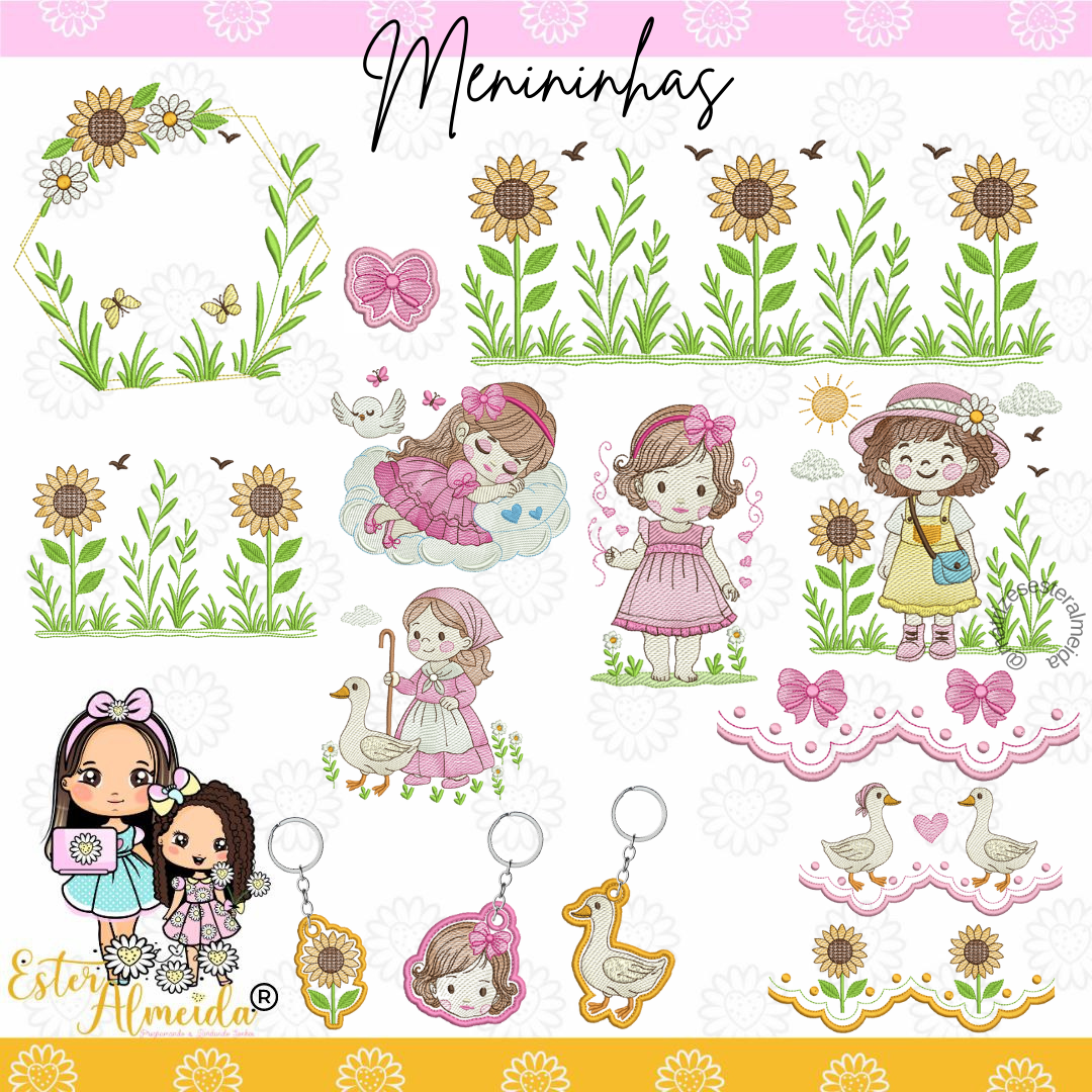 Prepare o coração, porque a nova coleção Menininhas está disponível e é impossível escolher uma só! De gansinhos delicados a meninas cheias de estilo, cada matriz foi pensada para transformar seus bordados em verdadeiras peças de arte.